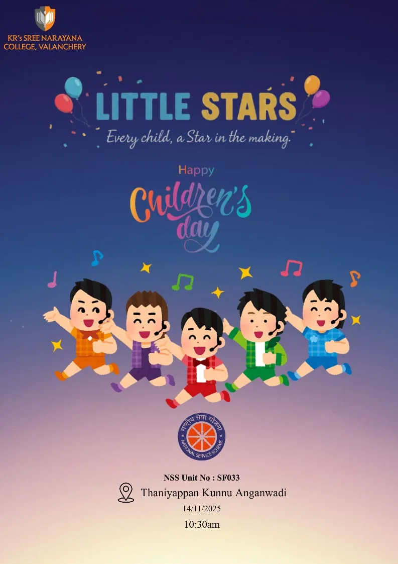 KR’s Sree Narayana College, Valanchery (NSS Unit No: SF033) is organizing a joyful Children’s Day program titled “Little Stars” at Thaniyappan Kunnu Anganwadi. The event celebrates the spirit, innocence, and creativity of children with fun activities, music, and cheerful performances.