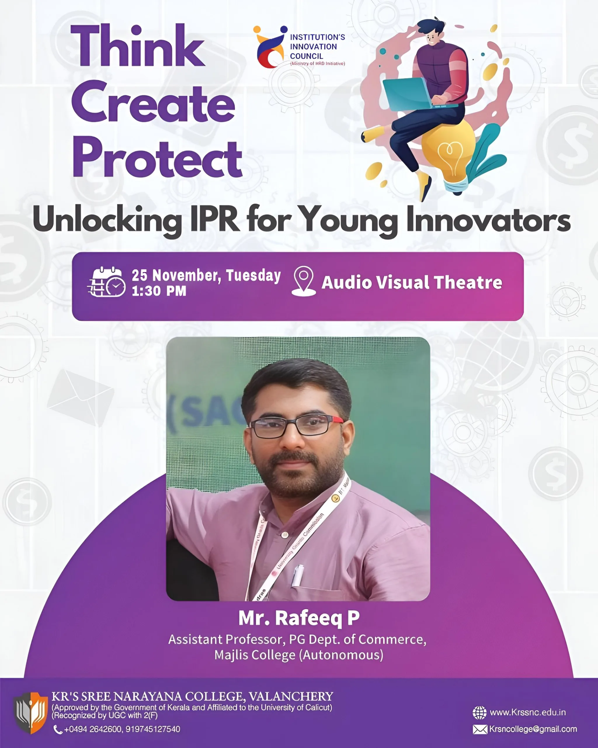 KRās Sree Narayana College, Valanchery, under the banner of the Institutionās Innovation Council (IIC), is hosting an inspiring session on Intellectual Property Rights (IPR) aimed at nurturing creativity and innovation among young minds.