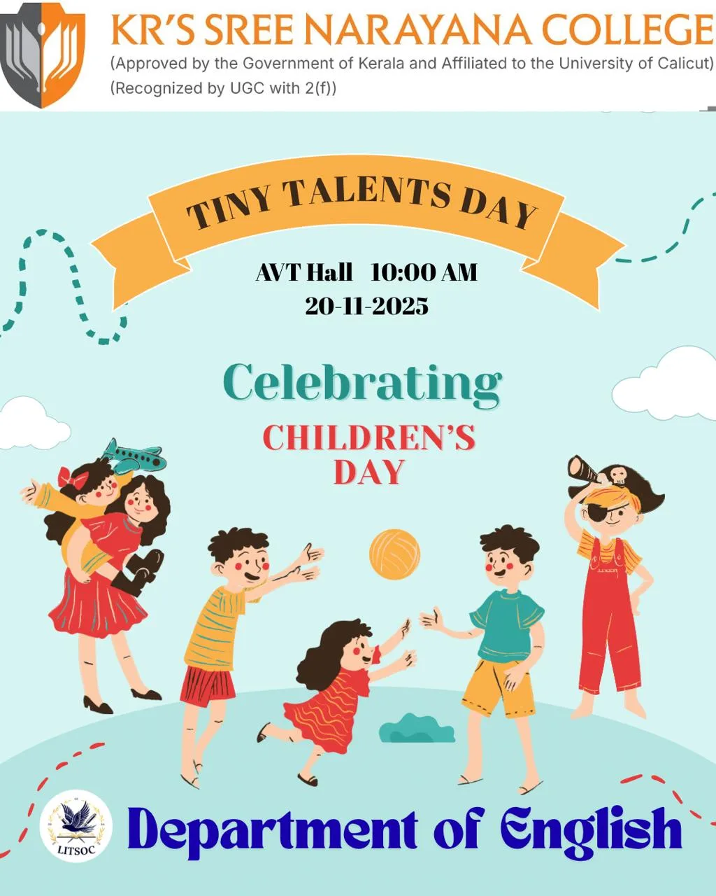 The Department of English, KR’s Sree Narayana College, Valanchery, is organizing Tiny Talents Day in celebration of Children’s Day. The event will take place on 20 November 2025 at 10:00 AM in the AVT Hall.