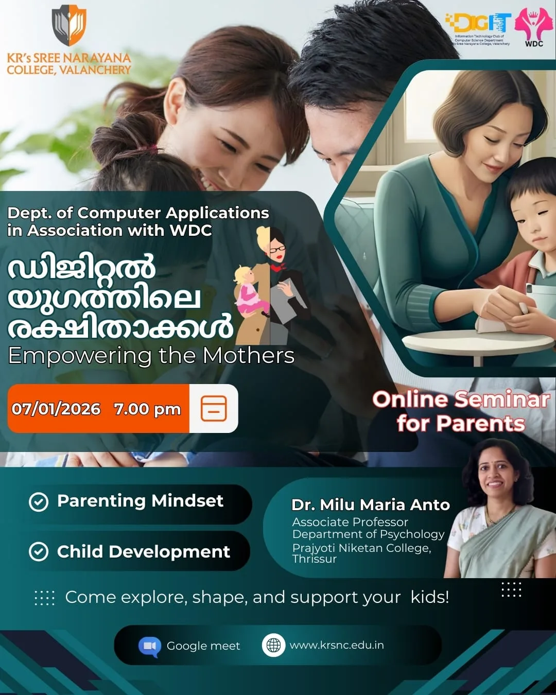The Department of Computer Applications, in association with the Women Development Cell (WDC) of KR’s Sree Narayana College, Valanchery, proudly presents an online seminar for parents.