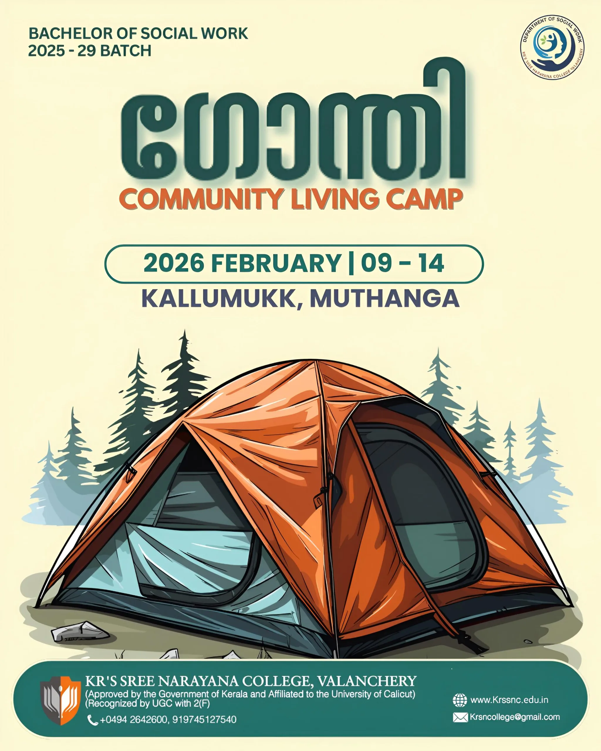 The Community Living Camp “Sahayi” was organised as part of the Bachelor of Social Work (BSW) curriculum to provide students with hands-on exposure to community life and social realities. The camp aimed to help students understand rural and tribal community structures, collective living, leadership, cooperation, and social responsibility through experiential learning.