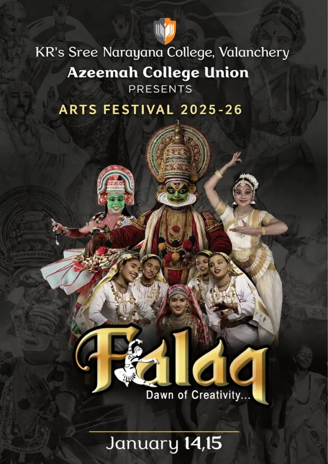 Falaq – Dawn of Creativity is the annual arts festival of KR’s Sree Narayana College, Valanchery, celebrating the richness of Indian art, culture, and creative expression. The festival brings together vibrant performances, traditional art forms, and youthful talent, creating a platform for students to showcase their artistic excellence.
