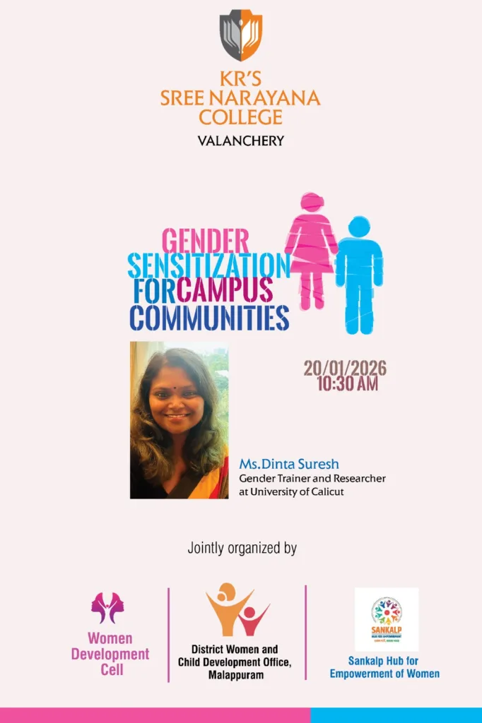 The Women Development Cell of KR’s Sree Narayana College, Valanchery, in association with the District Women and Child Development Office, Malappuram and Sankalp Hub for Empowerment of Women, organizes the Gender Sensitization for Campus Communities programme to promote awareness, equality and inclusiveness in campus life.