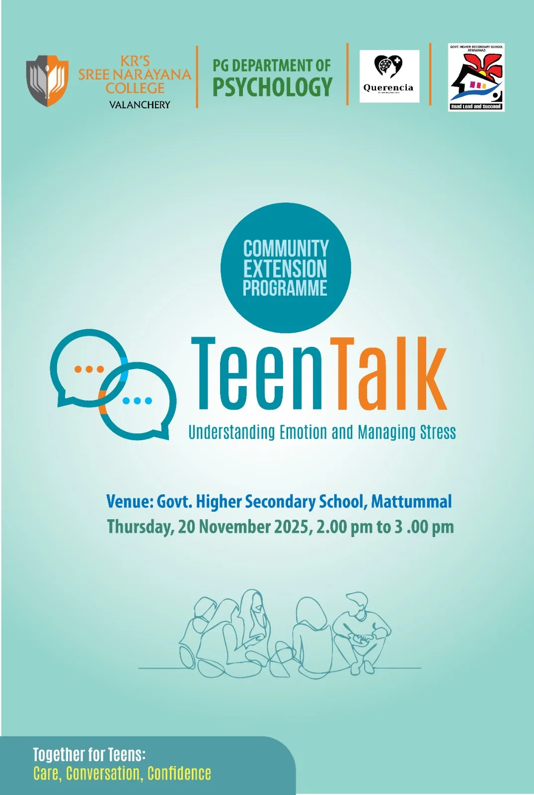The PG Department of Psychology, KR’s Sree Narayana College, Valanchery, is organizing a Community Extension Programme titled TeenTalk aimed at supporting the emotional well-being of adolescents.
