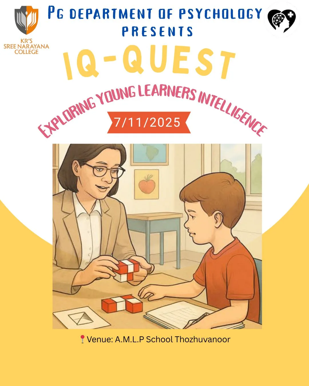 Through hands-on tasks, guided assessments, and child-friendly problem-solving activities, IQ-QUEST aims to provide valuable insights into various aspects of intelligence—such as reasoning, memory, spatial skills, and critical thinking. The session will be facilitated by trained psychology postgraduates who ensure a warm, encouraging, and development-focused experience for each child.
