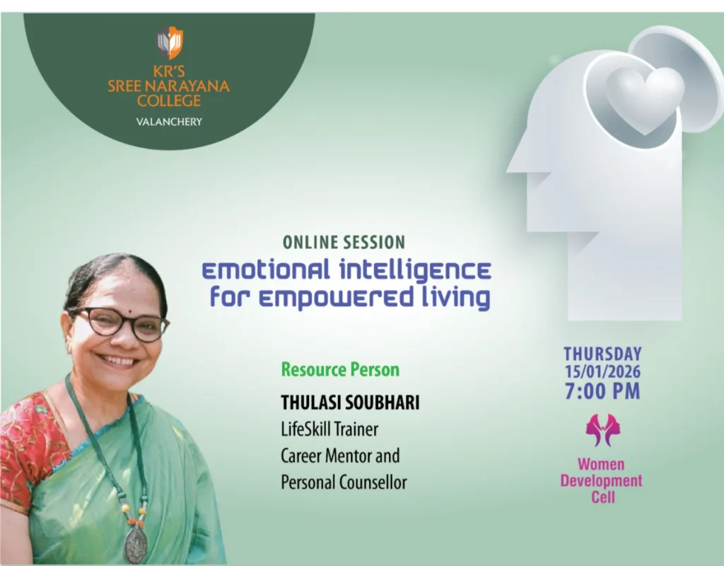 KR’s Sree Narayana College, Valanchery, through its Women Development Cell, is organizing an insightful online session focused on developing emotional intelligence to lead a more empowered, balanced, and purposeful life.