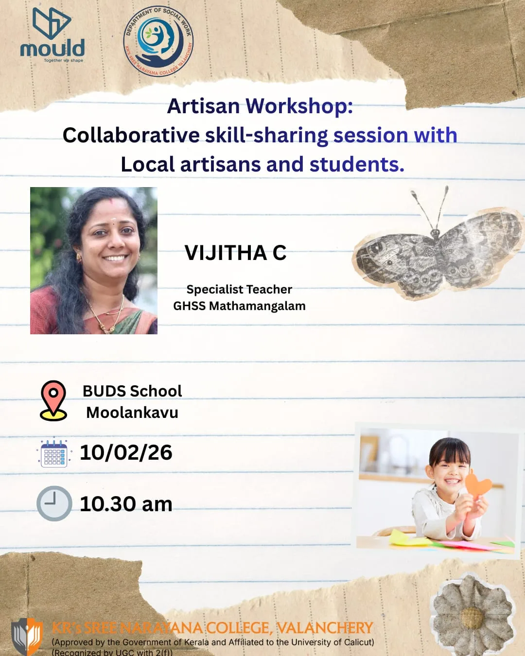 The Department of Social Work, in collaboration with MOULD, KR’s Sree Narayana College, Valanchery, is organizing an Artisan Workshop aimed at fostering creativity, collaboration, and experiential learning.