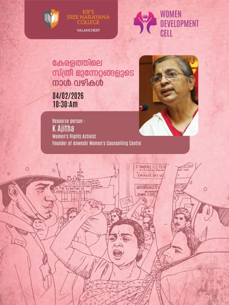 Narratives of Women’s Struggles in Kerala (Keralthile Sthree Munnottangalude Naal Vazhikal) 🎓 Organised by:Women Development Cell (WDC)KR’s Sree Narayana College, Valanchery ✨ About the Programme:This